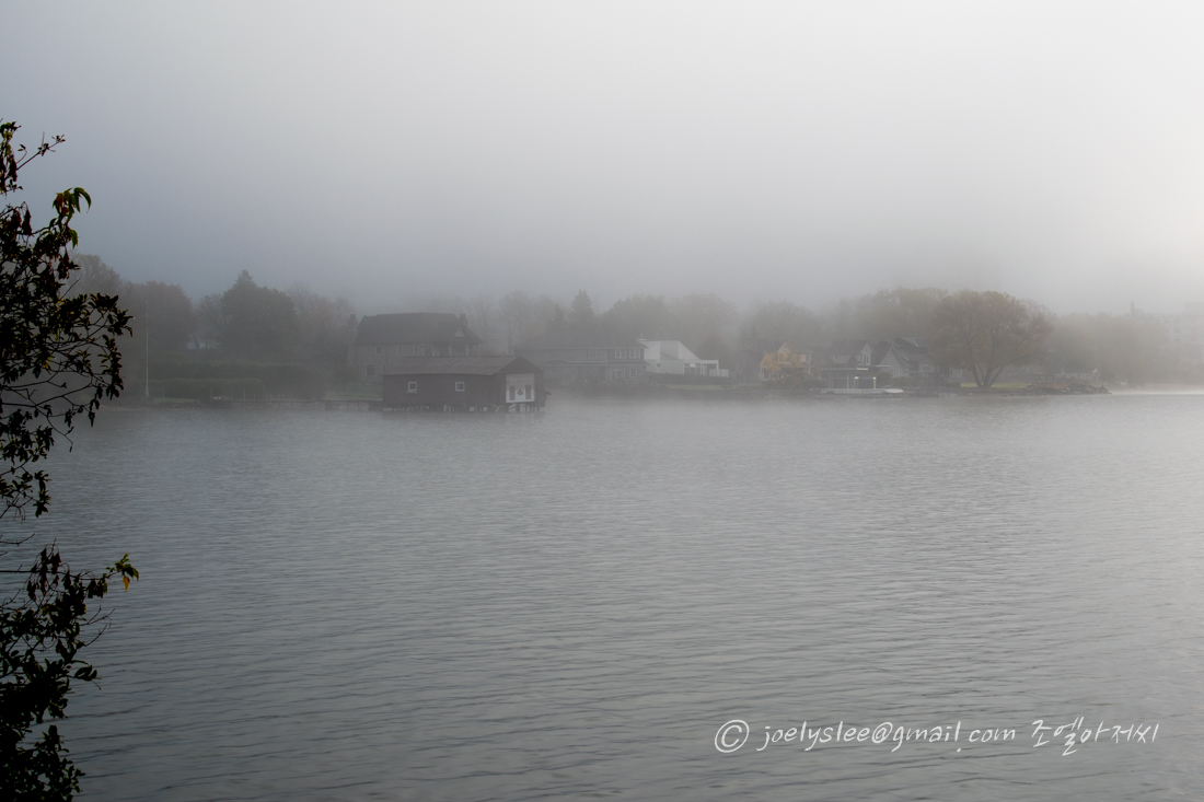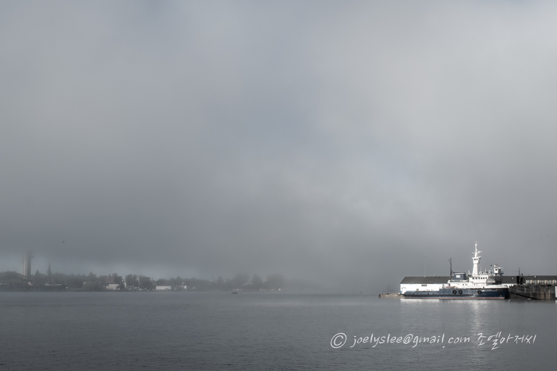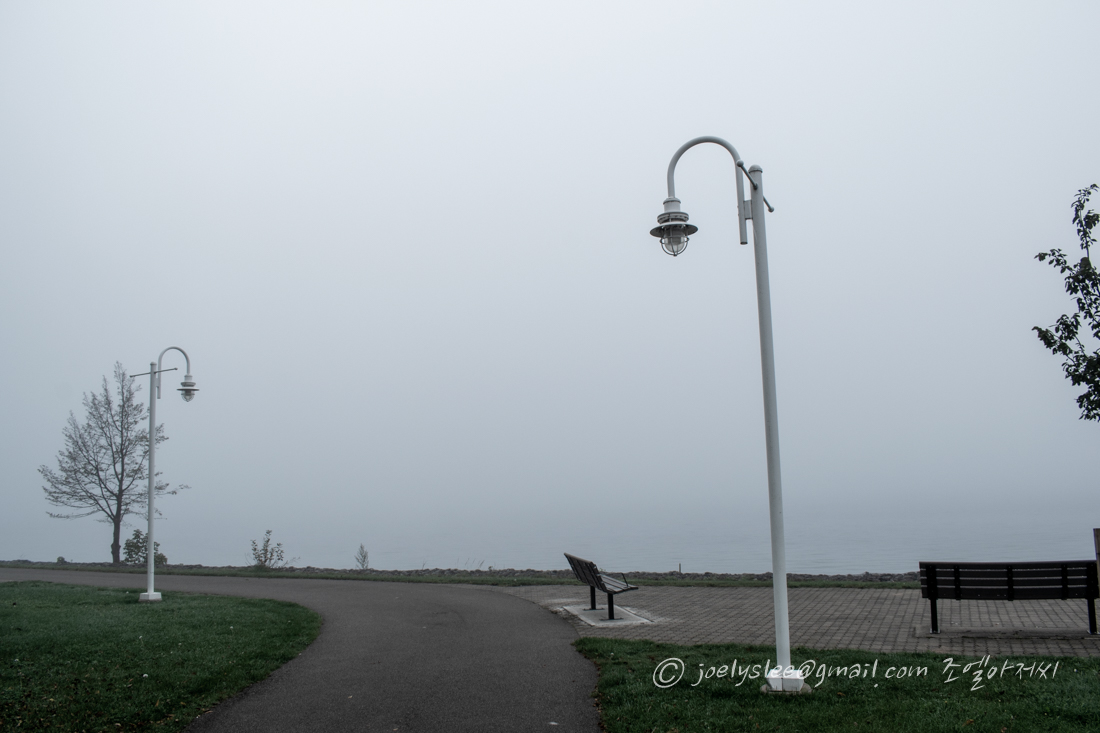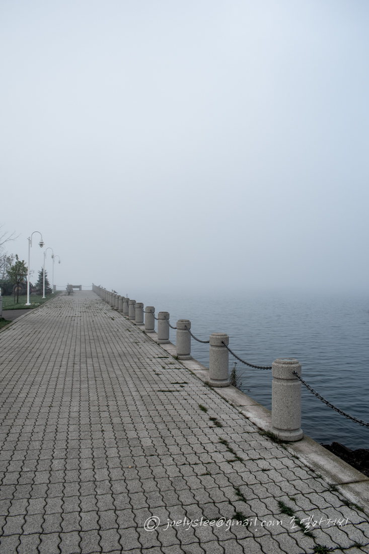 촉촉하거나 축축하거나 한 거리 아침이슬도 맺혀있고 평소에는 미국이 보이는 건너편 풍경도 안개로 인해 무한의 공간처럼 보여진다. 부둣가처럼 보이는 거리가 구도가 좋아보여 한컷.