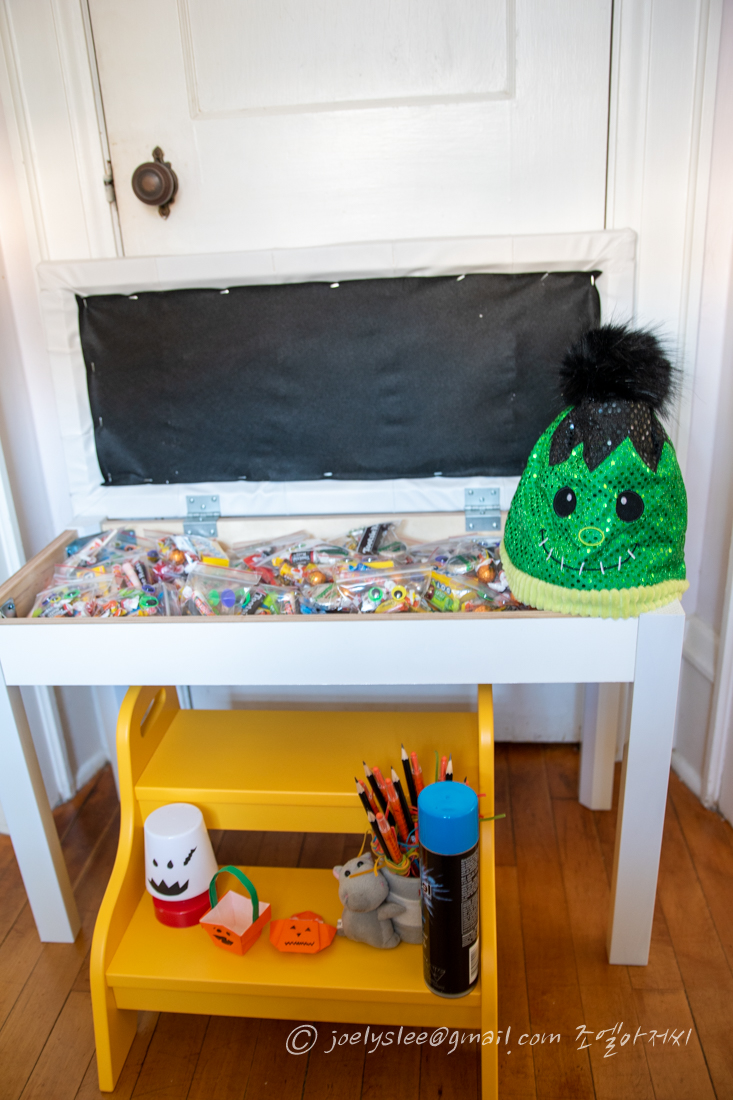 종이접기도 하고 사진에는 없지만 종이로 나중에 저 바구니를 길게 이어 붙이기도 하였다. 주인님 폰에는 있을꺼 같은데 함 물어봐야겠다. 사탕을 한바구니 사서 조그만 집락에 담아서 가져가기 좋게 만들었다. 대면으로 트릭 or 트릿 을 진행하기 부담스러울 수 있기에 이 피아노의자라고 쓰고 보물상자라고 읽는다는 준비물들은 나중에 문앞에 두었다.