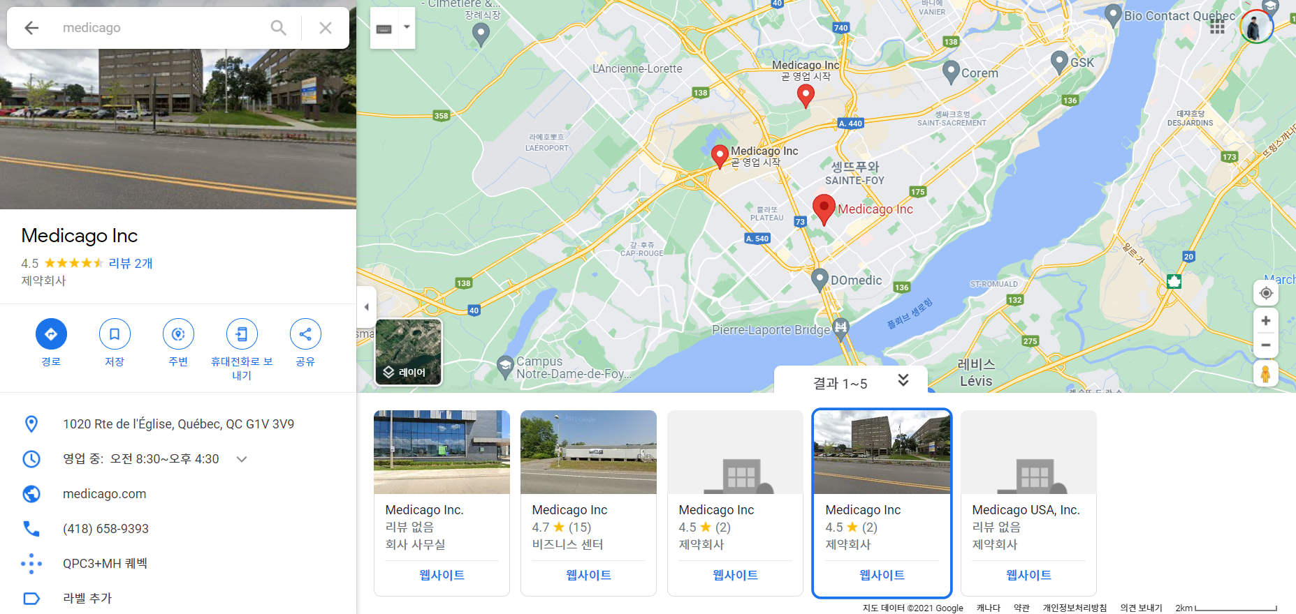 아무래도 Medic (치료사) + ago (이전의/ a go 가자~) 또는 Medi (의료) + Ca (캐나다) + Go (정부?? 고?) 를 합쳐서 회사이름을 지은듯하다. 연구소는 퀘벡주에 위치하고 있고 토론토 근처 브램턴에 사무실도 있고 Medicago USA Inc 도 있다. 아무래도 연구소는 제법 건물이 많아 3군데 주소지를 가지고 있으며 브램턴과 미국에는 주소지가 한군데 보인다. 마케팅을 위해 세운 건물들인듯하다.